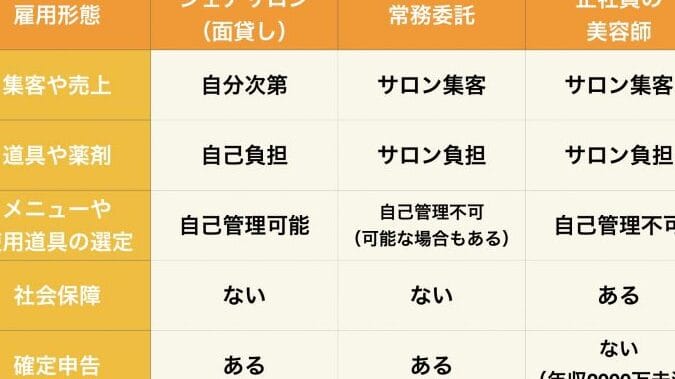 | 業務の独立性 | 委託者の指示に従う | 美容師が自分の顧客を管理 |