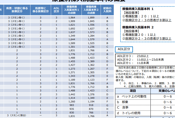 療養病棟入院基本料1と2の比較表