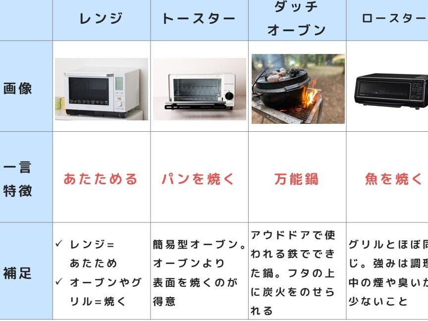 オーブンとトースターグリルの違いの比較表
